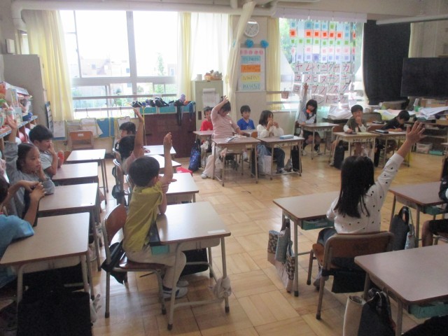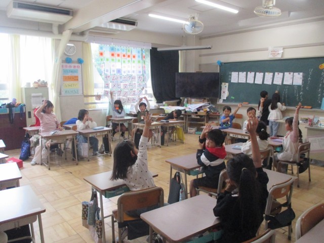 1年生が係決めの学級会をしていました。司会者を立て、話し合いする姿。頼もしい様子です。