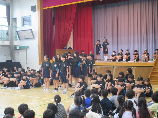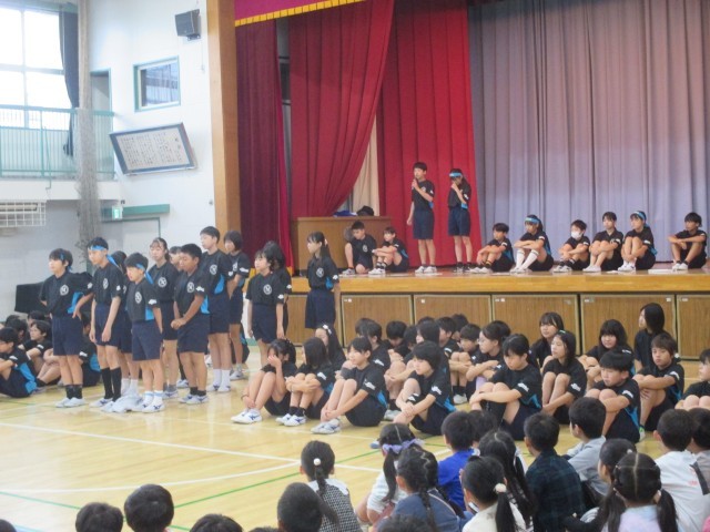 明日、体育大会に出場する6年生を激励するために、全校児童が集まり、体育館で激励集会が開かれました。6年生が種目ごとに、意気込みや決意を語る中で、1~5年生は言葉一つ一つからその種目への熱い「思い」を感じ取っていました。