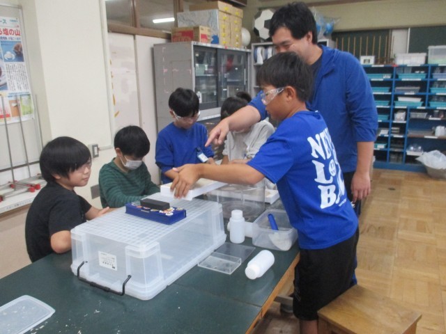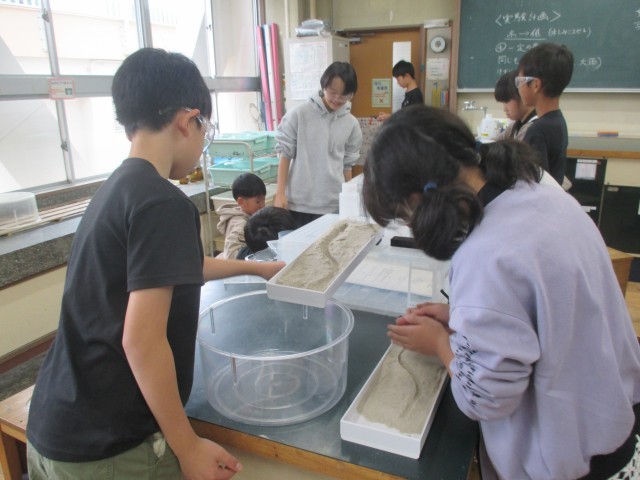 5年生が流れる水のはたらきの実験をしていました。砂で水の流れ道を作って水を流します。水の削る力、運ぶ力などを確かめる実験です。頭で分かっていても実際にやってみる。そのことが理解の定着につながります。
