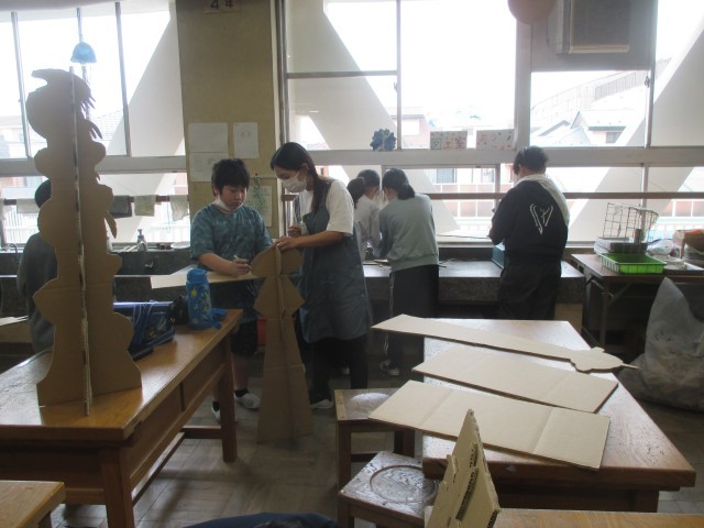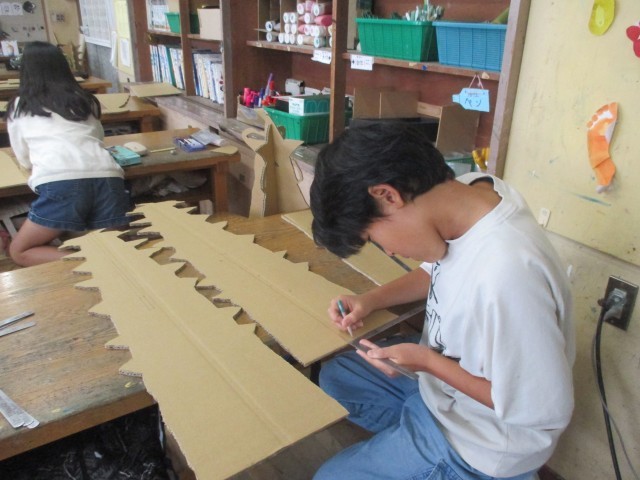 5年生が11月に行われる作品発表会にむけて、製作に取り組んでいます。段ボールを電気のこぎりで切り、ダイナミックな作品に仕上げています。どの子も真剣な表情です。