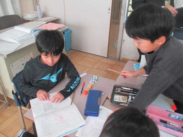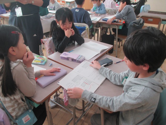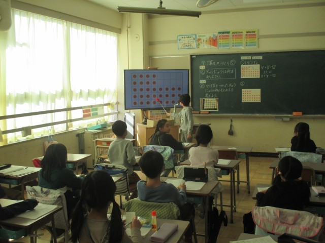 2年生が覚えたての九九を使って、文章題に取り組んでいました。簡単に九九を使うことができない問題の場合、どのように工夫すれば解けるのか。図を使って自分の考えをノートに書いたり、友達と交流したりして、工夫をいくつも見つけていました。全体での交流の場面では「〇〇さんといっしょ」「もっと違うやり方を説明できる」などの発言があちこちで聞かれ、クラス全体が積極的に取り組んでいました。課題解決型授業の中、子どもたちが自ら解決に向かっている姿が大変頼もしかったです。