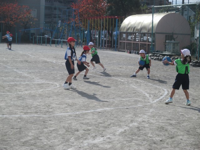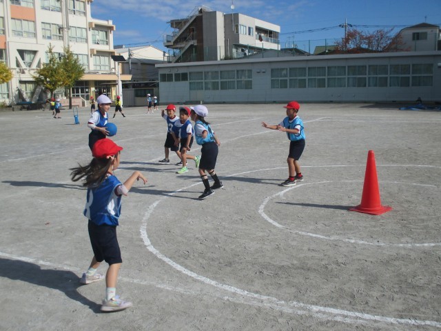 1年生が体育で、ボールを的に当てるゲームを楽しんでいました。的を守る役目の子もいるので、投げたボールがスムーズに的に当たるとは限りません。「こっちに投げて!」「パスして!」と子どもたちはチームで助け合ってゲームを進めていました。