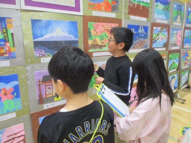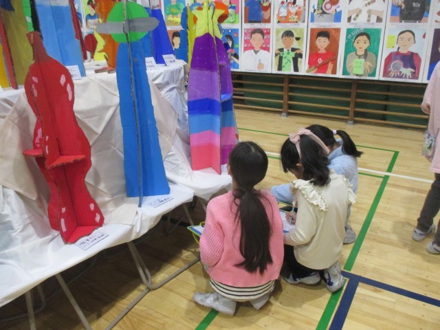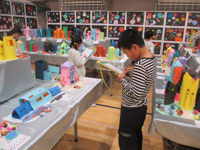 いよいよ始まりました「作品発表会」体育館いっぱいに、子どもたちの作品が展示され、いつもの体育館とは違う異空間です。それぞれの学年が時間をとり、じっくりと鑑賞をしました。子どもたちは自分の作品だけでなく、友達の作品、他の学年の作品に見入っていました。「すごい」「感想を書く紙が足りない」など、子どもたちは言葉にしきれないほど心を動かされ、この「作品発表会」を本当に心から楽しんでいる様子でした。