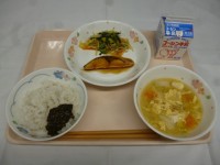 ごはん 目鯛の竜田揚げ 小松菜のツナマヨ和え 白菜と油揚げの味噌汁 八丈フルーツとレモンのミルク寒天 牛乳