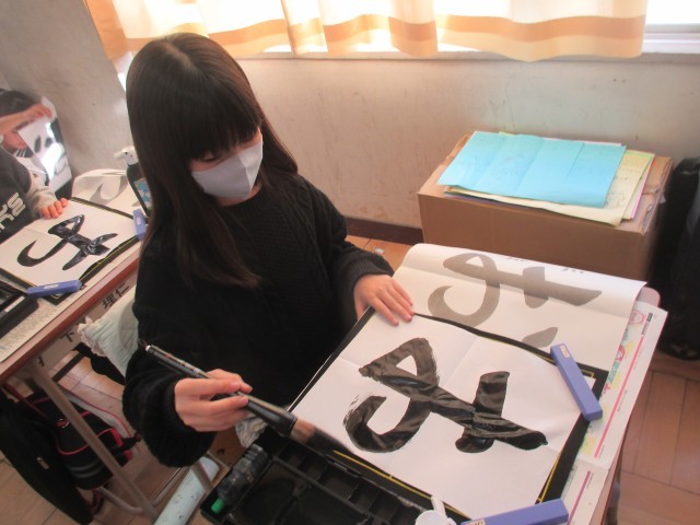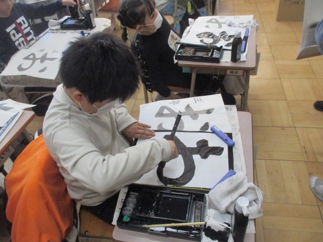 3年生にとっては初めての書初めです。今日はまず、「お正月」の「お」の練習をしました。いつもより太いだるま筆で書くので「むずかしい」「太くなりすぎた」という声も聞かれました。それでも集中して書いていて、一枚一枚と練習を重ね、上手になっているのが感じられました。