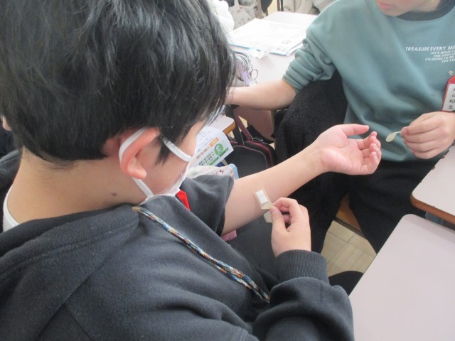 6年生が保健の授業で薬物乱用について学習していました。薬物だけでなく、アルコールについても学びます。手指の消毒用のアルコールを使って、自分の腕につけたときの反応を見ました。皮膚が赤くなったり、ピンクになったりすると、アルコールに弱い可能性があるそうです。子どもたちは「色が変わらないけど、将来、お酒は強いのかなあ」「お酒は強くないほうがいいなあ」など、自分の腕を見ながら友達と語り合っていました。