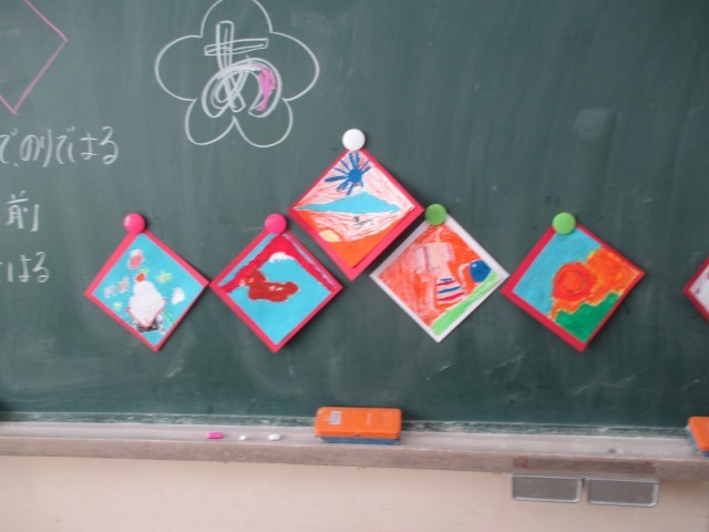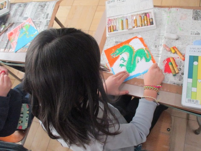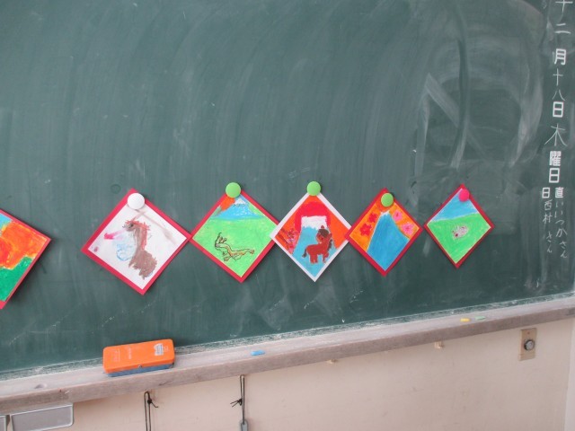 ちょっと早いですが、2年生の子どもたちがお正月の飾りになるような絵を描いていました。お正月らしい「招き猫」や「昇り龍」「羽子板」「朝日に輝く富士山」などを描いていました。「おうちに飾るんだ」「よくかけた!」子どもたちは、うれしそうに出来上がった絵を見せてくれました。