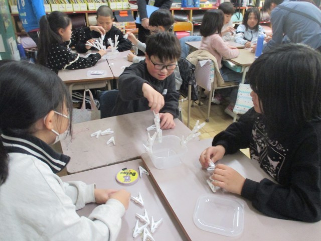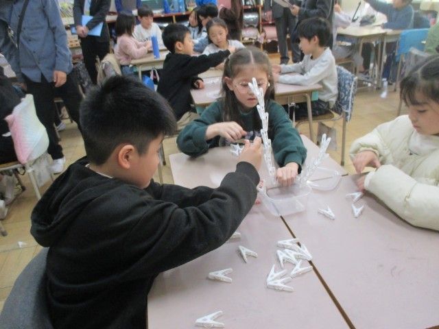 3年生向けに本校の「かえで教室」での活動を子どもたちに体験してもらう授業を行いました。「かえで教室」の役割を話した後、実際にやっている、「聞くトレーニング」や「話し合い活動」「手先の運動」などを体験しました。「聞くトレーニング」は、子どもたちは「ちょっと早い!」や「もう一回言ってほしい」などの声も聞かれました。また「手先の運動」では、洗濯ばさみを組み合わせて形を作る学習で、アッという間の45分間。子どもたちは夢中になって取り組んでいました。