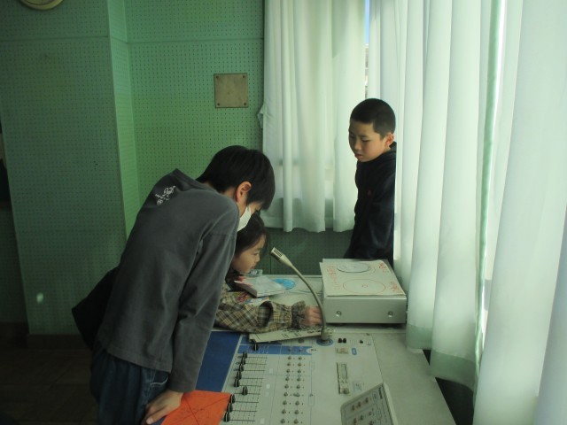 給食時間の放送室で活動している放送委員会の子どもたちです。給食の献立の紹介や、リクエスト曲、今月の歌の紹介など、おいしく楽しく給食を食べられるように声を届けています。原稿を見ながら真剣にマイクに向かう姿、間違えないように曲をかけようと機器を操作する姿。「みんなの役に立とう」と一生懸命取り組んでいました。
