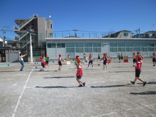 ボールを使って、投げる力を伸ばす学習です。的に目がけてボールを投げますが、間にはたくさんのさえぎる人が立ちます。その間をぬってボールを的に当て、倒さなければなりません。ボールを投げる子どもたちも、さえぎる役の子どもたちも、みんな夢中で取り組んでいました。楽しみながらみんなが投げる力をしっかりつけていってほしいです。