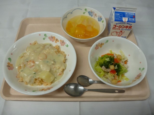えびとあさりのクリームライス ひよこ豆のサラダ フルーツポンチ 牛乳