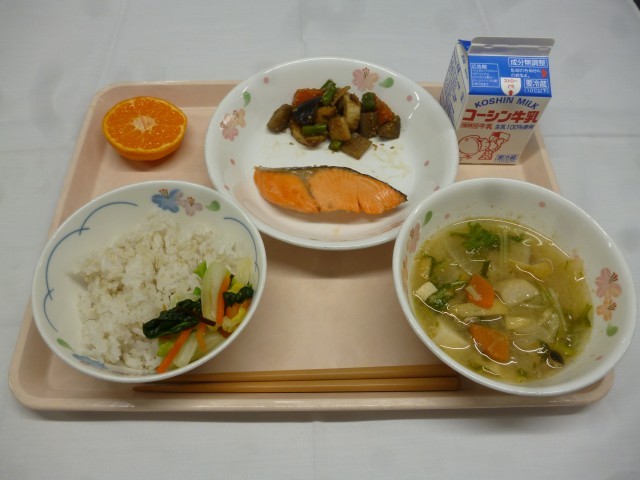 麦ごはん・おみ漬け・さけの塩焼き・こんにゃくと野菜のピリからいため・いもこ汁・みかん・牛乳