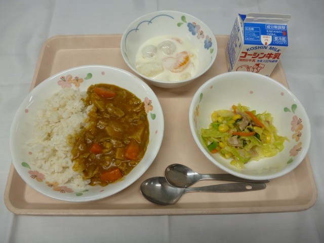 冬野菜のカレーライス ベーコンと小松菜のサラダ フルーツヨーグルト 牛乳