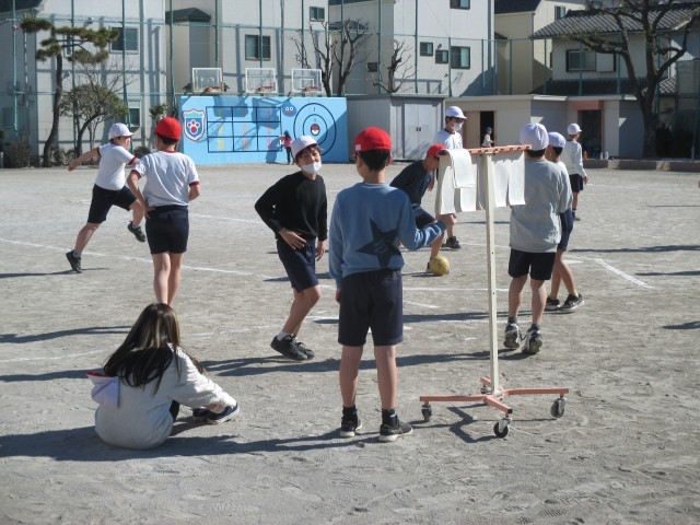 5年生は体育でキックベースに取り組んでいました。チームで力を合わせ、作戦を立ててゲームを行います。「思いっきり(けって)」や「走れ走れ」のかけ声。風が冷たい中でも子どもたちは精一杯取り組んでいました。
