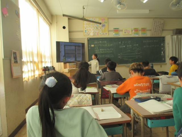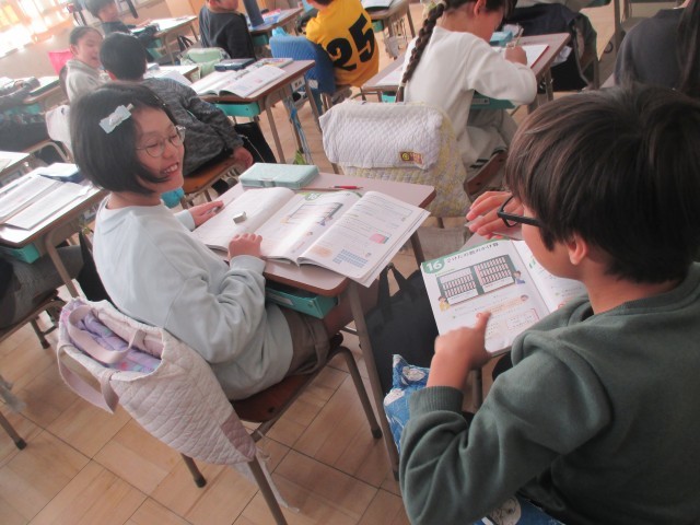 3年生が1けた×2けたのかけ算に取り組んでいました。問題を読み、どうやったら解けるかを友達と交流しながら考えていきます。ひっ算やそろばんを使えば、さっと計算できる、しかい、単位量あたりの考えかたを基礎に図を描き、説明を考えることで数学的な思考が深まります。子どもたちは積極的に自分の考えを友達に伝えようとしていました。
