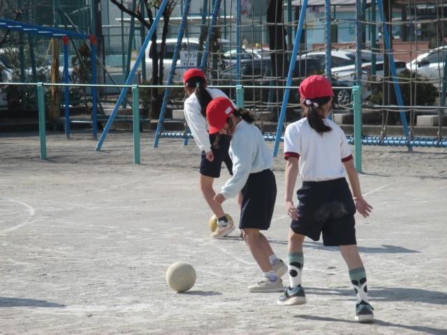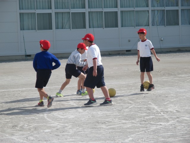 3年生がミニサッカーの前のドリブルの練習で「ドリブルおにごっこ」に取り組んでいました。このゲームは楽しみながら、ボールをキープしたり、突破したりするドリブルの力を付けることができます。子どもたちは、鬼にタッチされないようボールを巧みに?操りながら動き回っていました。