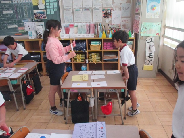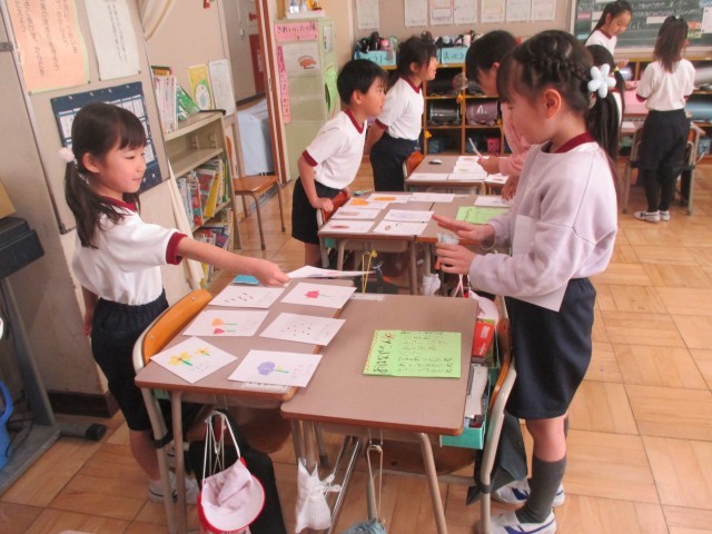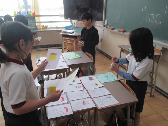 今日は、名詞(もののなまえ)を使って、おみせやさんごっこをしました。パン屋さんは、食パン、メロンパン、クロワッサンなど、文房具屋さんは、はさみ、のり、ノート‥‥。カードに描いた商品を手作りのお金で売り買いします。それぞれの立場にふさわしい言葉遣いや、数の単位の名称など、遊びの中にたくさんの学びがありました。