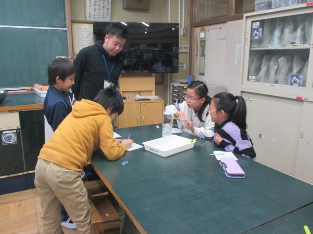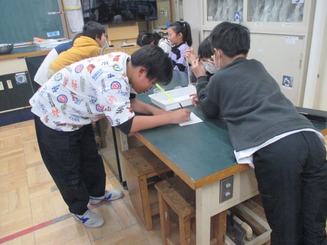 「すがたをかえる水」では、水を沸騰させたとき、凍らせたとき、様々に条件を変えて、水の状態を見ていきます。今日は、水を凍らせる実験を行っていました。氷と塩を入れたビーカーに水が入っている試験管を浸すと水はどのようになっていくか。1分ごとに温度と状態を観察しました。実験となると、子どもたちは真剣です。「1分経ったよ。温度は?」「何か氷みたいになってる」など、班の友達と協力しながら実験を進めていました。