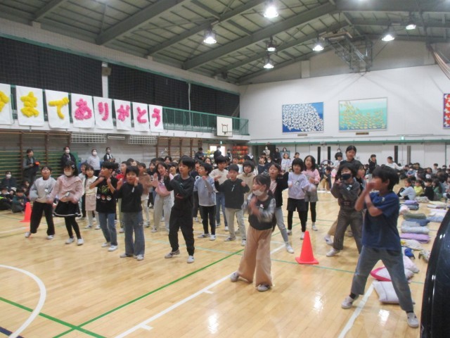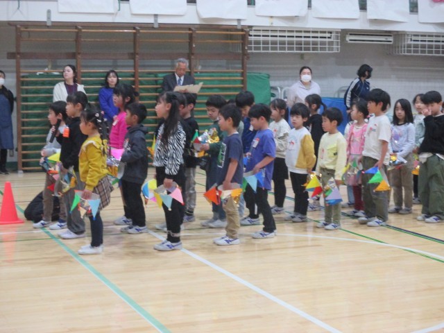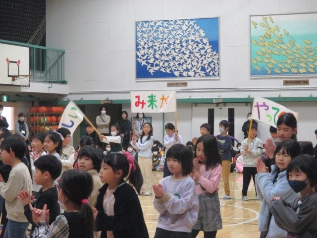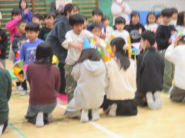 今日は6年生を送る会が開かれました。6年生にこれまでの感謝の気持ちを伝えようと、どの学年も心のこもったプレゼントや演技を行いました。1年生は、カラフルな色の王冠のプレゼント、2年生は、歌とダンスの演技です。