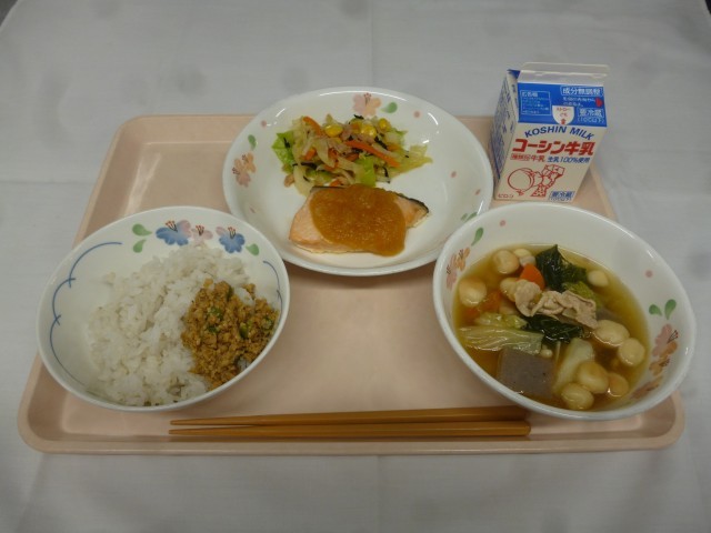 ご飯 鶏肉のそぼろ 鮭のおろしかけ ひじきとツナのあえもの 麩のあんかけ汁 牛乳