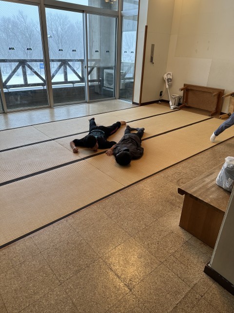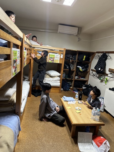 スキー教室を終え、宿舎に帰り、部屋でくつろいでいます。もしかしたら、子どもたちはスキーの時以上に元気?!