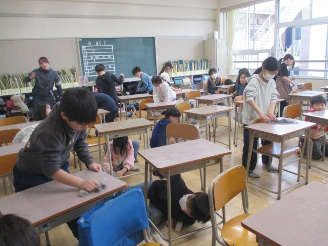 一年間お世話になった教室を大掃除。心を込めて、隅々、掃除をしました。次に入る人のために、ピカピカになるまで磨いている姿。1年間で子どもたちは「思いやる心」が育ちました。