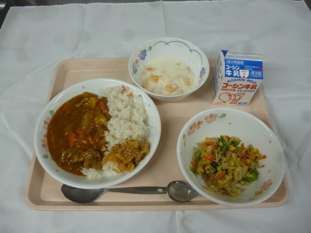 カレーライス 手作り福神漬け 春キャベツとじゃこのサラダ フルーツヨーグルト 牛乳