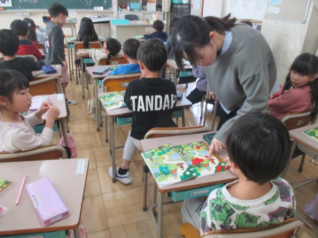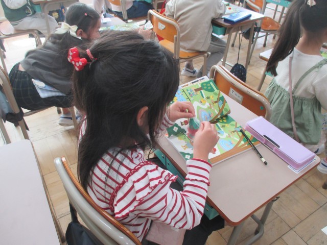 1年生が算数の学習に取り組んでいました。「絵の中に帽子がいくつあるかな」絵を見て数えたり、その数をおはじきに置き換えたり。この操作を繰り返しながら、算数の学習の素地で最も大切な「量感」を養っていきます。「量感」が身につくことで数学的な見方、考え方が深まっていきます。1年生の学習は、簡単なように見えて、その実、これからの学習の素地をつくっていく一歩でもあります。先生も丁寧に繰り返して教え、子どもたちもしっかり聞いて学習に取り組んでいました。