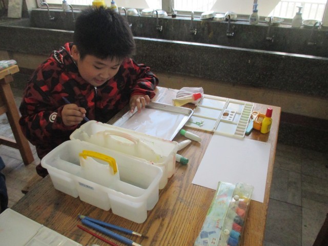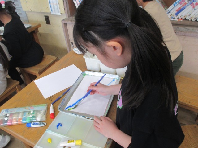 4年生が、お気に入りの色の組み合わせでにじみ絵を描いていました。パレットに一色づつ丁寧に絵の具を絞り出し、「これと、これ合うかな」とつぶやきながら、あらかじめぬらしておいた紙に色をのせていきました。するとお気に入りの色が、瞬間で違う表情をみせ、子どもたちも思わず「わー」と声が出ていました。