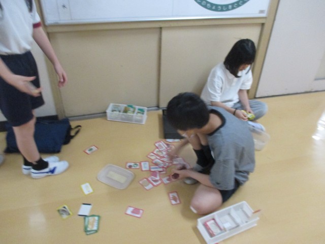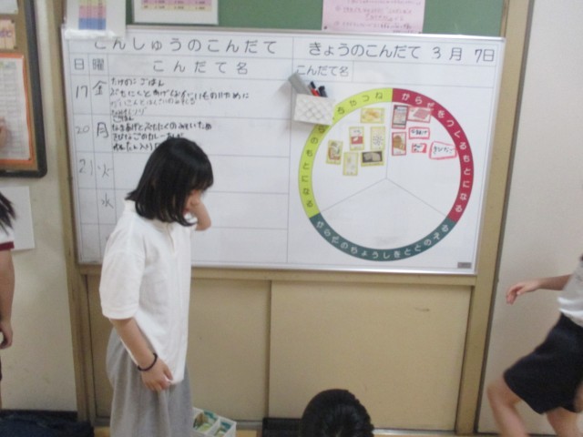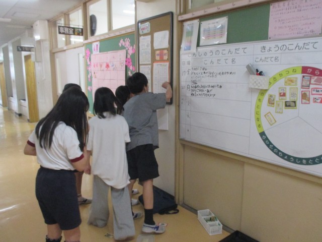 給食委員会は、毎日の給食の献立を見て栄養黒板を書いています。「ワンタンって何の栄養があるの?」など、家庭科での学習も思い出しながら友達同士で協力しながら書いていました。