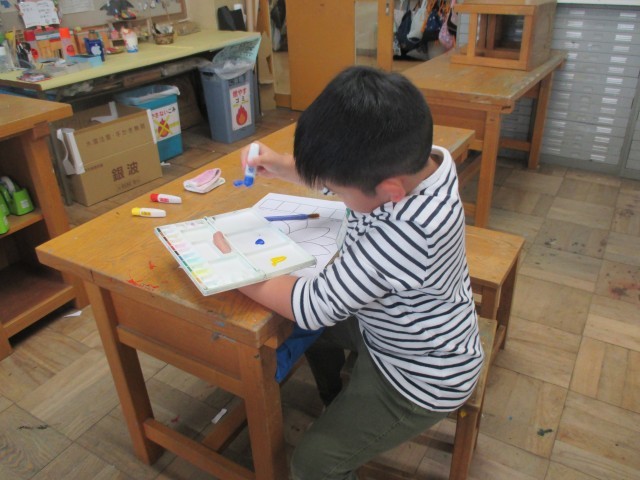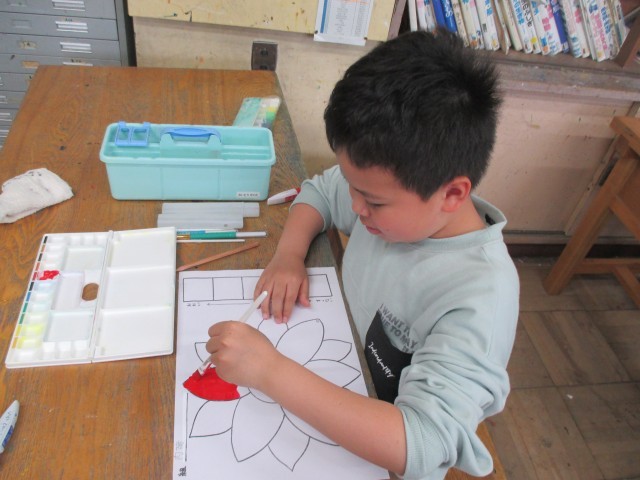 3年生は図工で、赤、青、黄色に白を加えたら、黒を加えたら、どうなるだろう。と色の実験(?!)をしていました。花びらにそれぞれの色を塗りながら、「どんな色になるんだろう」と慎重に作業を進めていました。組み合わせて、薄めて、濃くして、暗くして、明るくして、色の変化を楽しんでいました。