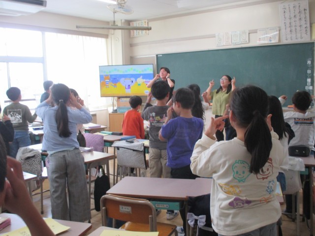 4年生はいろいろな国の挨拶の学習をしています。「インドは?」「ナマステ!」「ケニアは?」「ジャンボ」子どもたちは、ゲームを通してたくさんの国の名前とあいさつを覚えていきました。