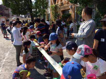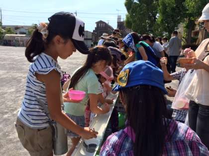 流しそうめんをしてくれました。参加した子供たちは、そうめんを箸で上手につかんで楽しそうに食べていました。