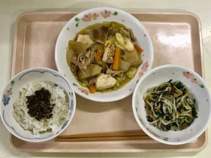 給食のすき焼き風煮は、汁まで飲めるように薄味で、しかも具には味が染み込んでいるようにつくります。
