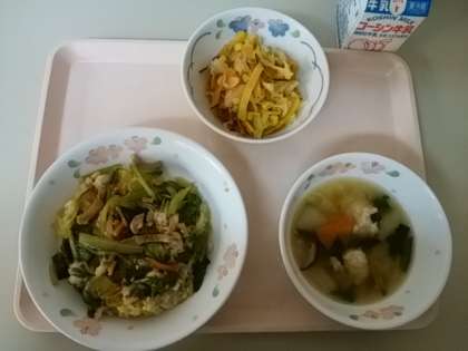 チャーハンは具がタップリのあんかけ付き、スープは手作り肉団子入り、サラダはさつまいもチップ入りとそれぞれに色々な材料が使われ、調理に手間がかかり調理師さんも作るのに苦労されていました。