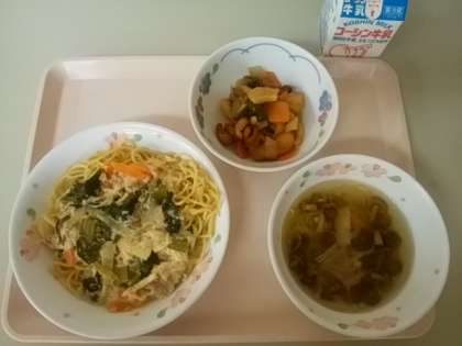 給食では、そのままではなく炒めた中華麺に同じ具材のさらさらのあんをかけて仕上げました。