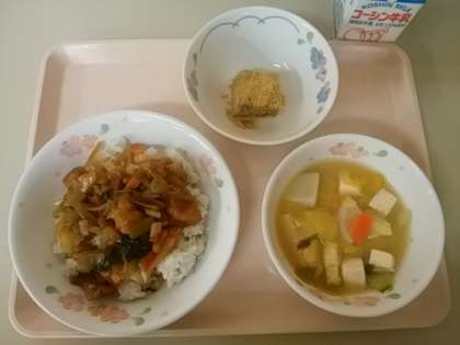 丼は、野菜のあんかけに小さめの鶏のから揚げを入れてご飯にかけました。
