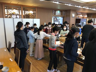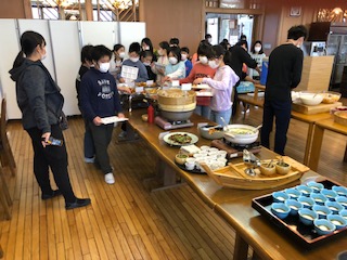 2日目の朝食は、バイキングです。栄養のバランスを考えて、選んでいる子や自分の好きなものだけ選んでいる子、いろいろですが、みんなとても嬉しそうです。これから雪山歩きなので、しっかり食べています。