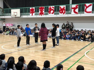 3月6日、今日は6年生を送る会がありました。6年生に各学年からプレゼントや出し物がありました。6年生は、とても嬉しそうでした。お礼に6年生から合奏と合唱がありました。さすが6年生の合奏と合唱は素晴らしかったです。