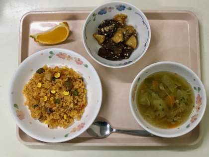 ケチャップで味付けをしたチキンライスは、バターで米を炒めてからガラスープで炊きます。