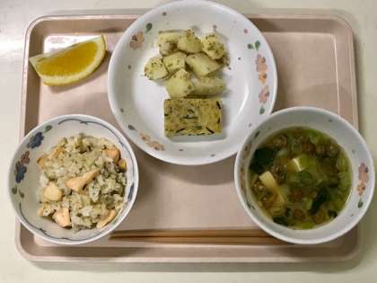 児童のみなさんに人気のご飯は、照り焼きにした鮭が入り、バターがふわっと香るおいしい炊き込みご飯です。