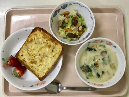トーストはじゃがいもを蒸してつぶしてから、チーズを入れてマヨネーズで和えた具をパンに塗って焼きます。