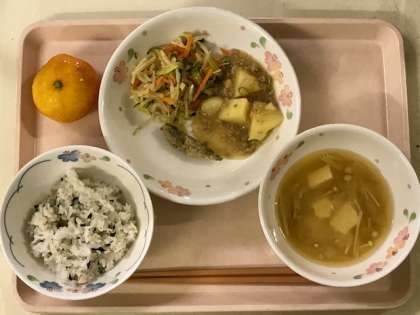 付け合わせにさきいかが入ったサラダに、じゃがいもをひき肉のあんかけで合わせた煮物がつきました。