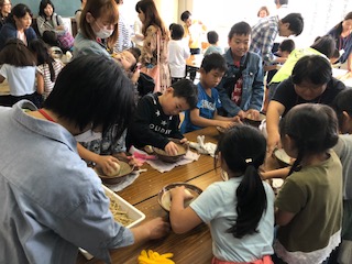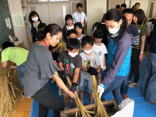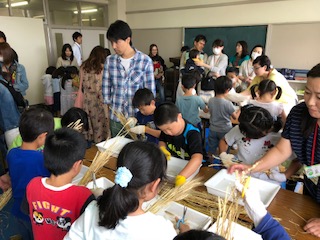 2年生が小麦の脱穀機を使って脱穀しました。たくさんの保護者の方々がお手伝いしてくださいました。