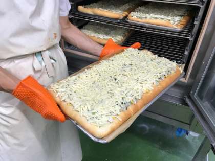 二時発酵してからオーブンで焼き、グラタンとチーズを溢れんばかりに乗せて、もう一度焼いて出来上がりです。