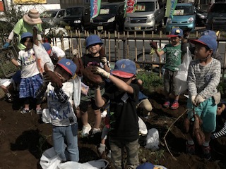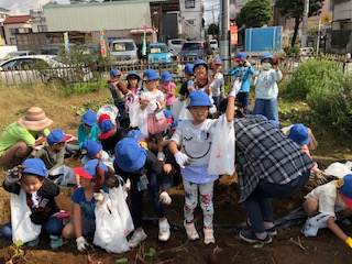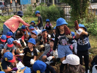 10月17日、今日は1年生が芋掘りをしました。5月に学校農園に植えたさつまいもの苗が大きく育って、たくさんのおいもができました。芋掘りには、たくさんの農園ボランティアの方々がお手伝いしてくれました。