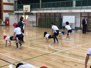 全学年にお話をしていただいたあと、6年生にストレッチと体幹を鍛える運動を教えていただきました。