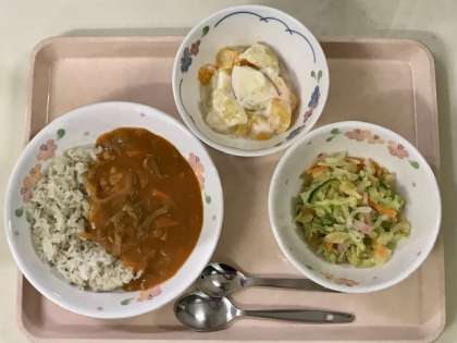 サラダはローストしたアーモンドを入れて香ばしく、フルーツヨーグルトはシロップをヨーグルトにまぜて甘く作りました。