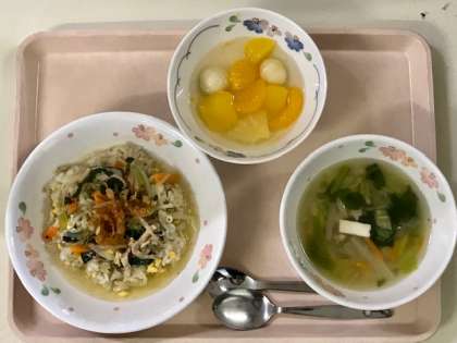 香ばしいワンタンの皮の食感も楽しいチャーハンは、あんかけの中に千切りの豚肉、ねぎや人参、たけのこしいたけなどが入りました。