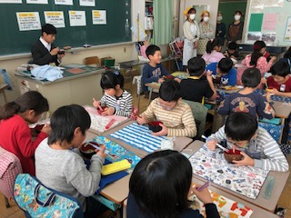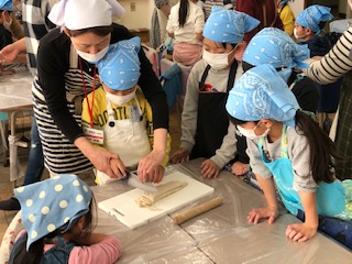 2年生は、12月14日にうどん作りをしました。1年生の時に、小麦の種をまき、世話をして小麦が実ったのを今年の6月に収穫しました。自分たちで脱穀して、粉にしたものを使ってうどん作りをしました。小麦をこねて、伸ばして、切ってうどんを作りました。こしがあってとても美味しいうどんができました。この一年がかりの活動を学校農園ボランティアのみなさんが支えてくださり、今日も各クラスに10名以上の保護者のみなさんがお手伝いいただきました。ありがとうこざいました。